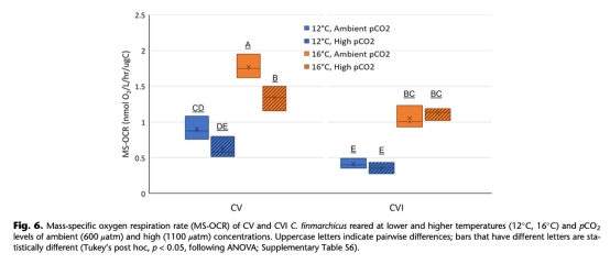 質量特異性耗氧率(MS-OCR)在低溫(12°C)和高CO?下顯著降低(圖6)。