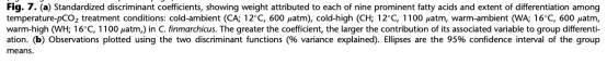 判別分析(DA)解析脂肪酸組成的溫度與CO?響應模式。