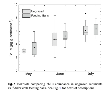 招潮蟹攝食:招潮蟹攝食球(feeding balls)與未攝食沉積物的葉綠素a濃度無(wú)顯著差異(圖7),表明其不直接消耗BMA。