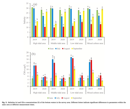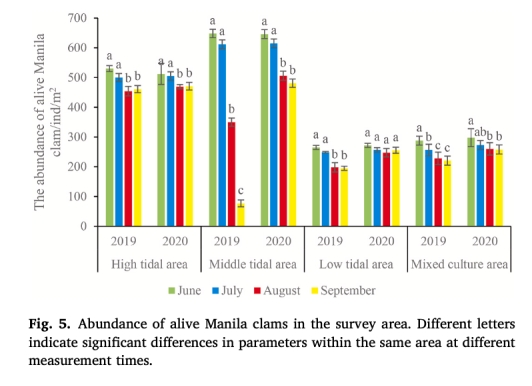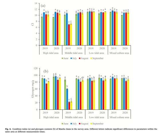 研究通過2019–2020年夏季對萊州灣菲律賓蛤仔養殖區的野外調查,探究環境因素對其夏季高死亡率的影響。結果顯示:2020年未發生大規模死亡事件,環境因子空間差異不顯著;而2019年8月中潮區出現顯著環境異?!罡咚疁?1.49°C、硫化氫(H?S)濃度峰值24.72 μmol/L、溶解氧(DO)最低值3.35 mg/L,同期該區域蛤仔存活率下降80%。糖原含量較肥滿度(CI)更敏感地反映蛤仔健康狀態,主成分分析表明高溫、低氧與H?S的協同脅迫是導致死亡的主因。