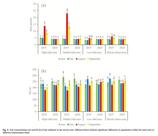 密度效應:高養殖密度(中潮區)加劇有機污染,促進低氧/H?S生成,增加死亡風險(表1顯示中潮區OC與H?S正相關)。