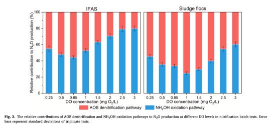 產生途徑調控:生物膜減少AOB反硝化途徑貢獻10-20%,增加NH2OH氧化途徑貢獻(IFAS中44-80% vs. 懸浮污泥25-60%)。