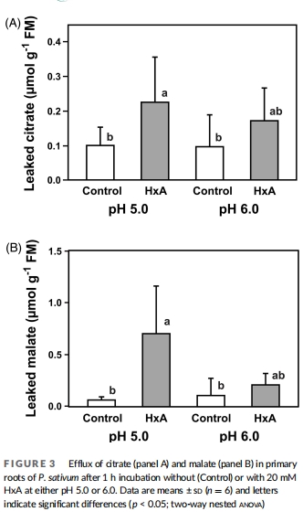 豌豆根在pH 5.0/6.0下暴露于20 mM HxA或BtA 1小時(圖1)。