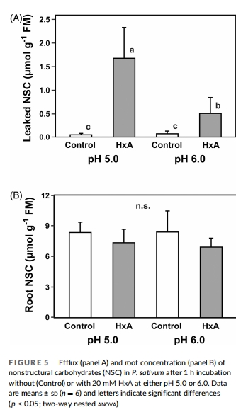 酸性條件下(pH 5.0),未解離的HxA進入細胞,觸發檸檬酸、蘋果酸和非結構性碳水化合物(NSC)從根系滲出(圖3, 5),導致克雷布斯循環底物耗竭,從而限制線粒體呼吸。