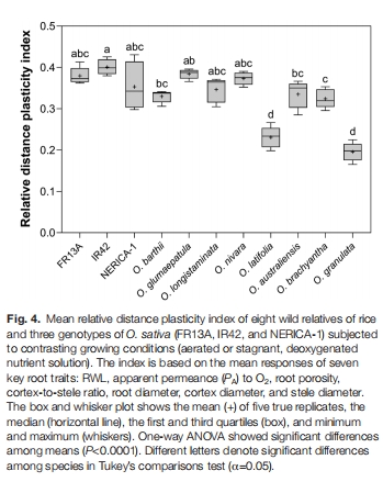 根系可塑性:濕地稻種(如O. glumaepatula)比旱地稻種(如O. granulata)表現(xiàn)出更高的表型可塑性(圖4)。