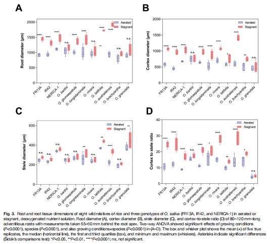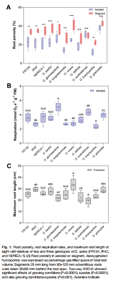研究對(duì)象:8種野生稻屬植物和3個(gè)栽培稻(O. sativa)基因型在模擬淹水(停滯脫氧營養(yǎng)液)條件下的根系響應(yīng)。