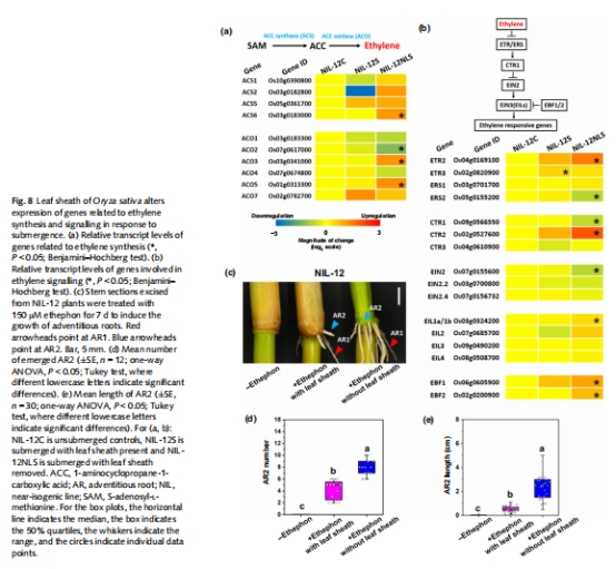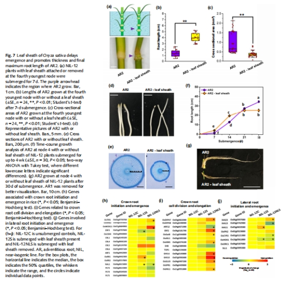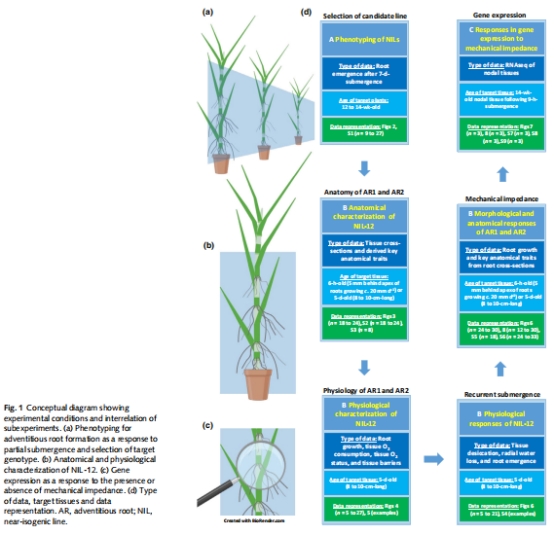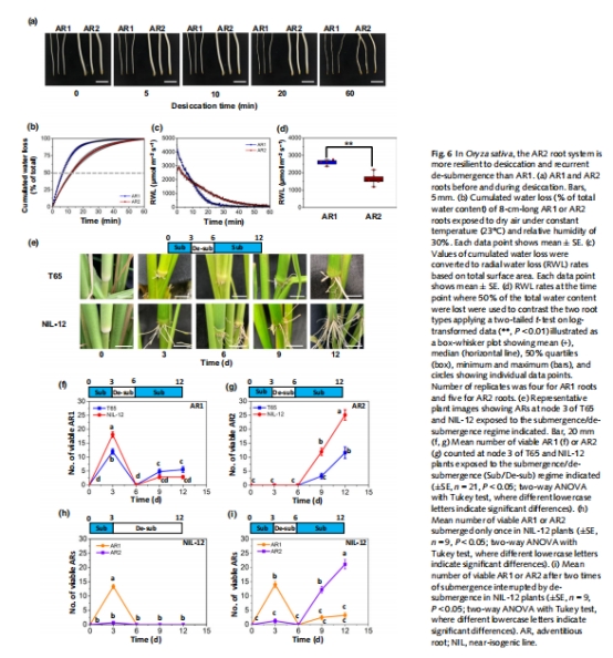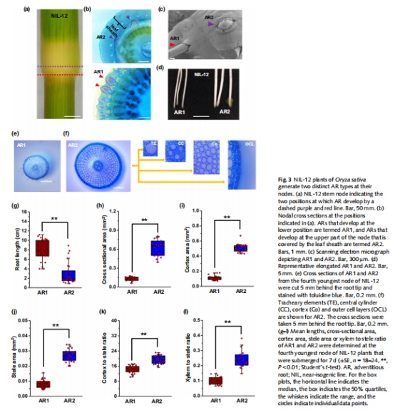 研究對象:深水稻(Oryza sativa)在洪水脅迫下形成兩種水生不定根(AR1和AR2)的遺傳與生理機(jī)制。