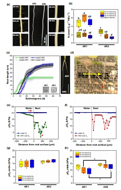 徑向氧分布(Unisense) 圖4e-h AR2根表氧濃度高于AR1,證實其形成氧擴(kuò)散屏障(減少洪水缺氧損耗)。