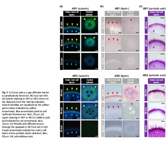 葉片鞘作用:葉片鞘的機(jī)械阻抗延遲AR2萌發(fā),但促使其形成更粗的根系和更強(qiáng)的氧擴(kuò)散屏障(圖5, 圖7)。