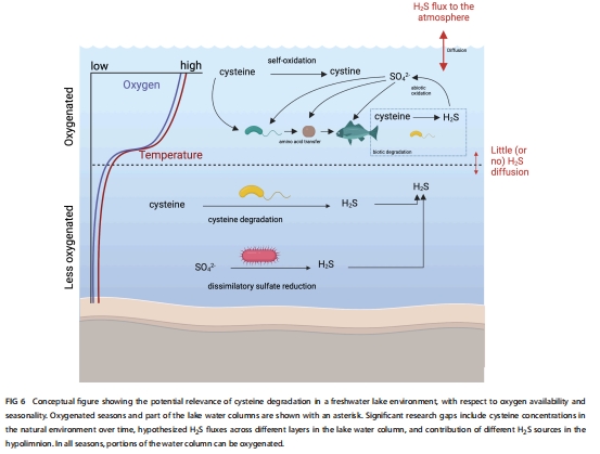 論文揭示了淡水湖泊富氧環(huán)境中細(xì)菌通過(guò)降解半胱氨酸(Cysteine)產(chǎn)生硫化氫(H?S)的現(xiàn)象。傳統(tǒng)認(rèn)為H?S主要源于缺氧環(huán)境的硫酸鹽還原,但本研究證明多種細(xì)菌(如變形菌門、擬桿菌門)可在有氧條件下通過(guò)降解半胱氨酸釋放H?S,拓展了對(duì)硫循環(huán)的認(rèn)知。