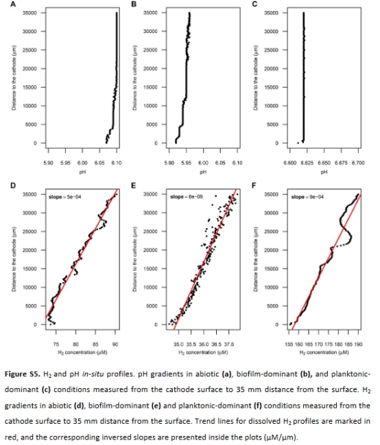 H?濃度梯度 Unisense H?微傳感器(圖S5) 證實陰極附近溶解H?濃度 > 0.6 mM,支持 H?介導(dǎo)的電子傳遞(MET)主導(dǎo)。