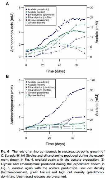 比較浮游與生物膜表型的 電流密度、產(chǎn)物積累(醋酸鹽、甘氨酸等)及 庫侖效率(圖4-5)。