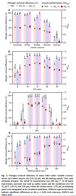 本研究分離出一株新型好氧反硝化菌Pseudomonas sp. YR02,其在好氧條件下具備高效N?O還原能力。關鍵發現: