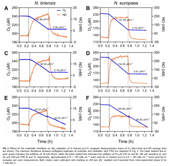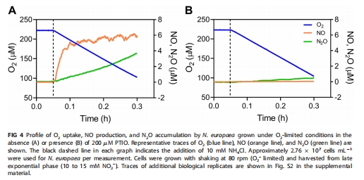 本研究通過電化學(xué)傳感器和溫和NO清除劑PTIO,探究了NO在模型氨氧化細(xì)菌(AOB)Nitrosomonas europaea中的代謝作用。核心發(fā)現(xiàn):