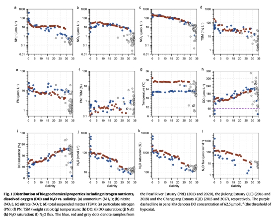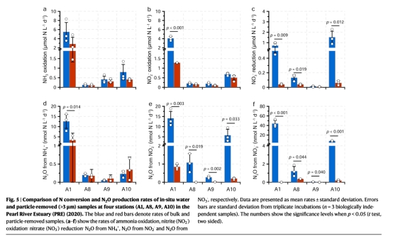 研究通過氮同位素標(biāo)記實驗,發(fā)現(xiàn)富營養(yǎng)化、高濁度的中國沿海水域(長江口、九龍江口、珠江口)是N2O排放熱點。與傳統(tǒng)認(rèn)知相反,在含氧水域中,反硝化作用(而非氨氧化)是N2O的主要來源(貢獻(xiàn)率>50%)。粒徑分級實驗和基因分析表明: