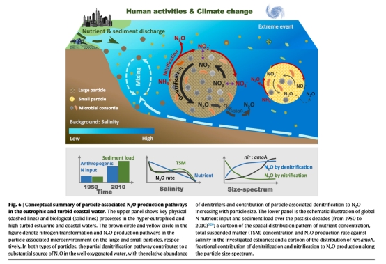 人類活動影響:營養(yǎng)鹽輸入和泥沙輸送增加顆粒物濃度,通過促進(jìn)反硝化加劇N2O排放(圖6)