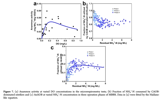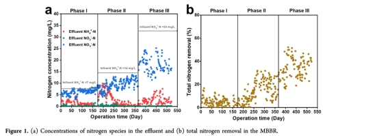 反應器運行:三級遞增氨氮負荷(I:7, II:14, III:33 mg N/L)下運行MBBR,維持超低DO(0.1-0.3 mg/L)。