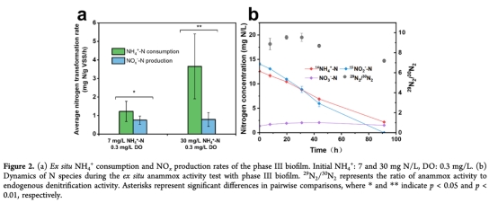 活性貢獻(圖2):15N示蹤顯示29N2(AnAOB產(chǎn)物)占比90%,證實其主導脫氮(內源反硝化貢獻<10%)。