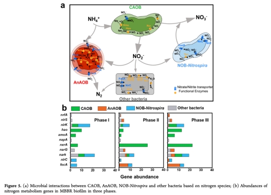 功能基因(圖5b):AnAOB亞硝酸鹽轉運基因(focA, nirC)豐度比NOB-Nitrospira高41.2%,解釋其高效亞硝酸鹽利用能力。