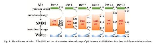 數(shù)據(jù):SMM厚度從1天300μm增至15天2500μm;pH在氣-膜-水界面突變(最大ΔpH=1.94)