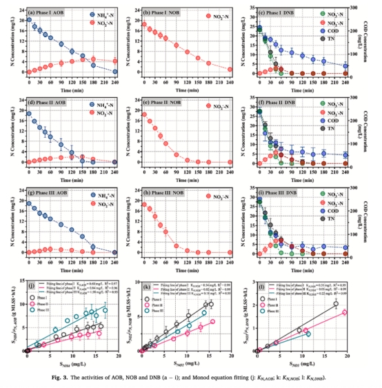 微生物動力學數據:包括氨氧化速率(AOR)、亞硝酸鹽氧化速率(NOR)、反硝化速率(DNR)及Monod動力學參數(如KN,AOB)。來源:圖3和表2。研究意義:量化功能菌活性(如DNB速率高達42.73 mg/L/h),解釋生物膜內擴散阻力變化(KN,AOB上升),并關聯系統脫氮效率提升(如μmaxNO3增加至15.02 mg/g MLSS/h),為優化生物膜載體設計提供依據。