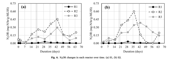 pH調控作用:pH 6.2系統的N?O排放量低于pH 6.8系統(407 vs 475 mg-N/day),表明弱酸性條件可抑制排放