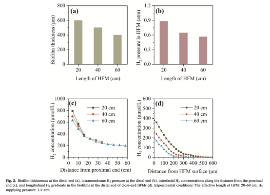 HFM末端生物膜厚度(圖2a):隨HFM長度增加(20→60 cm),厚度從600μm降至400μm,表明H?傳遞受限抑制生物膜生長。