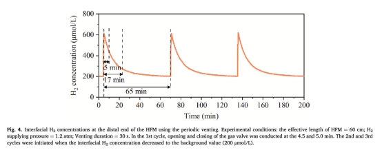 優化排氣策略:實時監測界面H?濃度變化(圖4)發現,排氣后濃度從200 μmol/L瞬升至620 μmol/L,但17分鐘后衰減80%,據此精準設定17分鐘排氣間隔以維持高效H?供給。