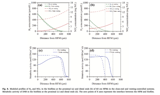生物膜內H?梯度(圖2d, 3b-c):丹麥Unisense微電極測量顯示,60 cm HFM末端活性區域(H? >10 μmol/L)僅0-225μm,而近端為0-575μm,揭示末端DNB活性受H?匱乏限制。