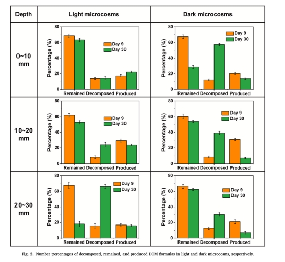 數(shù)據(jù):光照組DOM分解率<16%(黑暗組>30.4%),表層(0-10 mm)CHO化合物增加34%。
