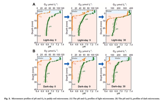 高分辨率氧動(dòng)態(tài):直接量化PBs導(dǎo)致的O?濃度梯度(表層350 μmol/L vs 黑暗組30 μmol/L),證實(shí)光合作用驅(qū)動(dòng)氧化微區(qū)擴(kuò)展(滲透深度達(dá)11.76 mm)。
