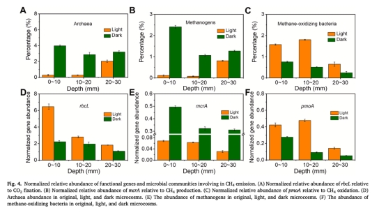 上調(diào)rbcL(CO?固定基因)和pmoA(甲烷氧化基因),下調(diào)mcrA(產(chǎn)甲烷基因)(圖4D-F)。