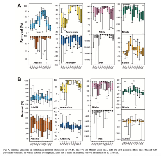 污染物去除的季節(jié)性:氮化合物和硫酸鹽的夏季去除率高于冬季(圖4),而砷和銻的全年去除率穩(wěn)定(TPA中分別為90%和70%)。