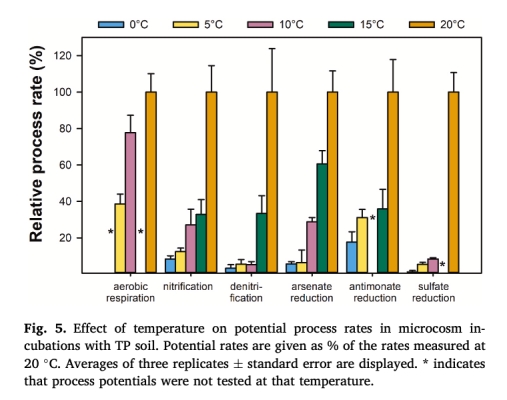 測定不同溫度(0-20°C)下硝化、反硝化、硫酸鹽還原、砷/銻還原的潛在速率(圖5)。