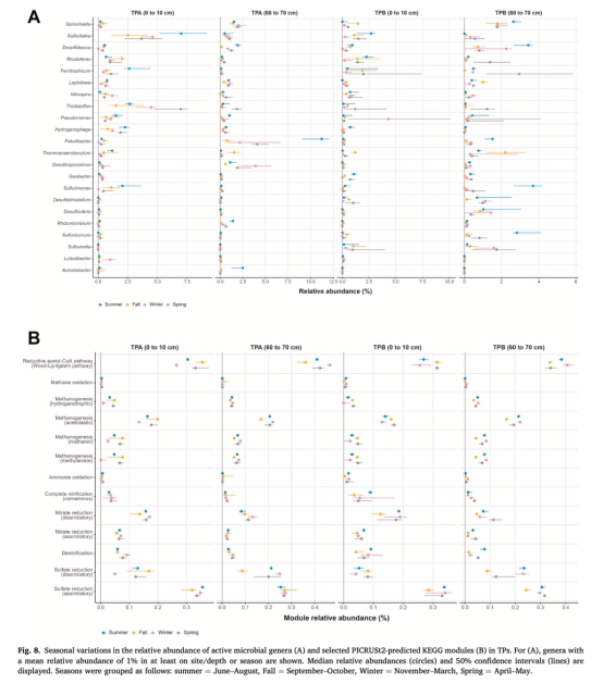 微生物群落:16S rRNA測序表明,潛在活性微生物群落結(jié)構(gòu)主要受泥炭地和深度影響(圖6),季節(jié)變化不顯著。優(yōu)勢菌門包括變形菌門(Proteobacteria)、擬桿菌門(Bacteroidota)等(圖7),含已知的硝化菌(Nitrosomonas)、硫酸鹽還原菌(Desulfobacca)及砷/銻還原菌(Sulfuritalea)。