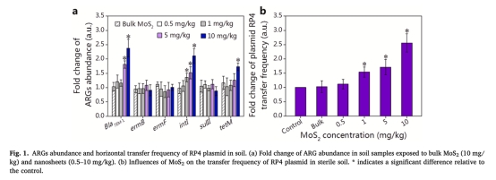 研究揭示了二硫化鉬(MoS?)納米片通過促進(jìn)細(xì)菌間質(zhì)粒水平轉(zhuǎn)移,增加土壤中抗生素抗性基因(ARGs)的豐度。關(guān)鍵發(fā)現(xiàn)包括: