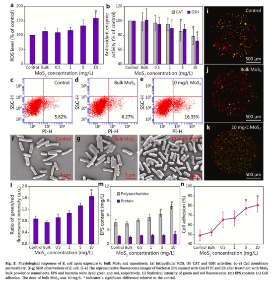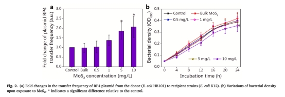 質(zhì)粒轉(zhuǎn)移機(jī)制:MoS?納米片劑量依賴性地加速RP4質(zhì)粒在E. coli間的水平轉(zhuǎn)移頻率(10 mg/L時(shí)達(dá)對(duì)照的2.07倍),而塊體MoS?無此效應(yīng)(圖1b, 圖2a)。