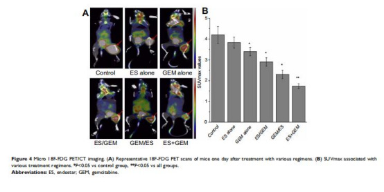 數(shù)據(jù):ES+GEM組SUVmax值最低(1.73),顯著低于對照組(4.2)和單藥組(ES組3.83,GEM組3.4)。