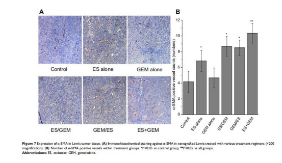 α-SMA上調(diào)(圖7):ES+GEM組α-SMA陽性血管最多(10.33條/mm2,對照組4.17條/mm2)。