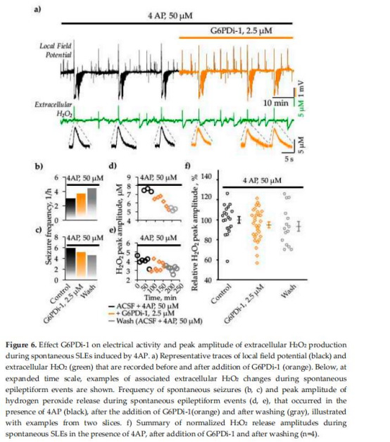 G6PDi-1不改變自發(fā)性癲癇樣事件(SLEs)頻率,但降低癲癇發(fā)作期間的H?O?釋放峰值振幅(圖6)。