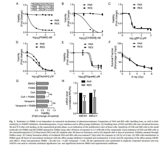 數(shù)據(jù):RES細(xì)胞對FK866完全耐藥(EC??不可計(jì)算),但對化療藥物(5FU、順鉑)敏感;Verapamil/CsA處理不逆轉(zhuǎn)耐藥;ABCB1/ABCC1表達(dá)無差異。