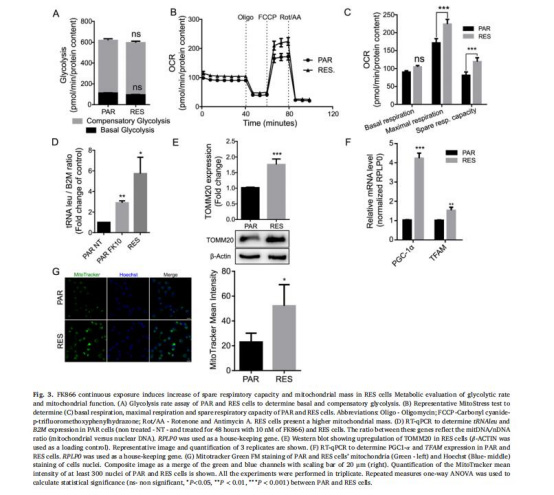 線粒體功能增強(qiáng):耐藥細(xì)胞線粒體備用呼吸能力(SRC)、線粒體質(zhì)量(mtDNA/nDNA比例增加)及生物合成(PGC-1α/TFAM上調(diào))顯著提升。