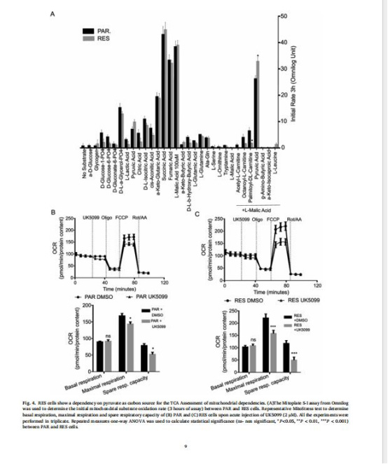數(shù)據(jù):Mitoplate分析顯示RES細(xì)胞對丙酮酸+低劑量蘋果酸氧化速率↑;UK5099(MPC抑制劑)降低RES細(xì)胞最大呼吸。