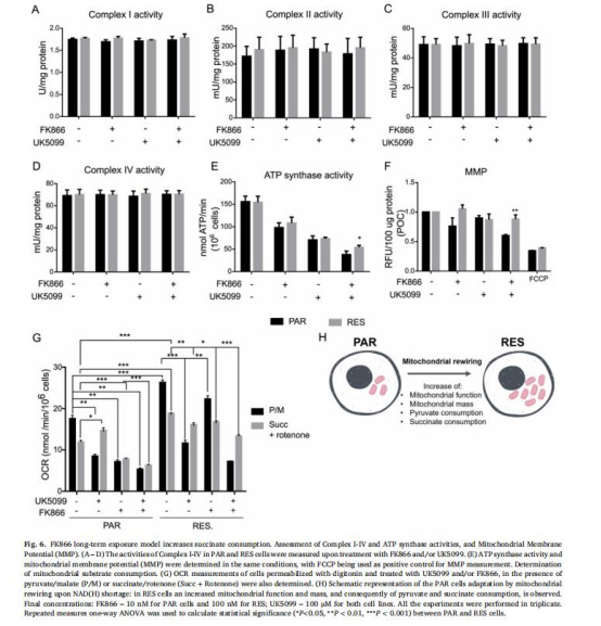 呼吸鏈復(fù)合物I-IV活性無差異,但ATP合成酶活性在FK866+UK5099處理下RES細(xì)胞更高。