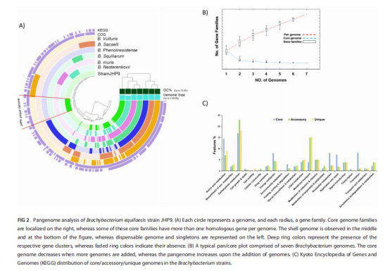 泛基因組分析(7株Brachybacterium),揭示核心基因(氨基酸代謝、能量代謝)和附屬基因(碳水化合物代謝、異生物質(zhì)降解)(圖2)。