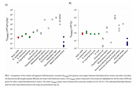 氧親和力:所有測試菌株Km(app) = 0.73–1.22 μM(圖5B),接近寡營養(yǎng)菌水平。