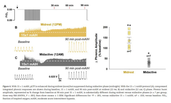 本研究揭示了膈肌長期促進效應(pLTF)——一種由急性間歇性低氧(AIH)引發的呼吸運動可塑性現象——在晝夜休息期與活躍期的表現差異及其機制。關鍵發現包括: