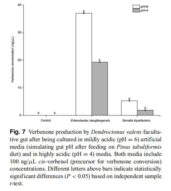 本研究探究了腸道pH環境對紅脂大小蠹(Dendroctonus valens)腸道菌群組成及其關鍵聚集/反聚集信息素verbenone產量的影響: