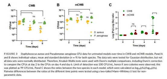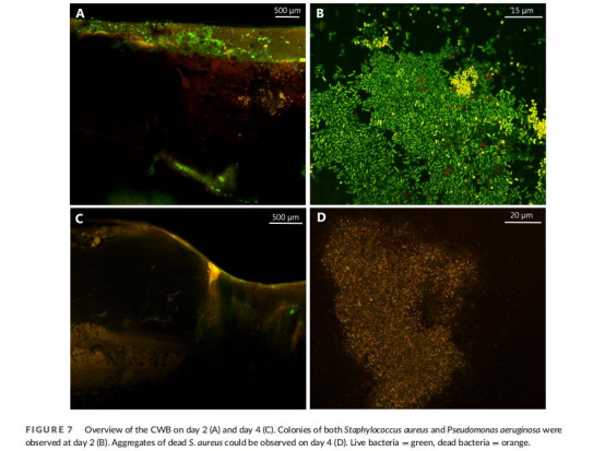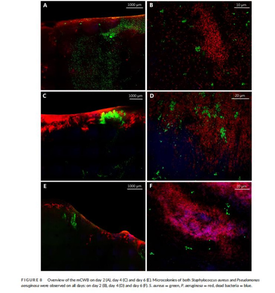 圖7顯示原始CWB模型中S.aureus形成微菌落但被P.aeruginosa抑制,死亡菌體聚集。圖8中mCWB模型(如day 4)顯示雙菌種形成大型生物膜聚集體和微菌落,S.aureus分布更深(至脂肪層)。意義在于:證實(shí)模型支持復(fù)雜生物膜發(fā)育(如菌種空間分層),模擬臨床傷口中菌群的異質(zhì)性和耐受機(jī)制,為抗生物膜策略提供形態(tài)學(xué)依據(jù)。