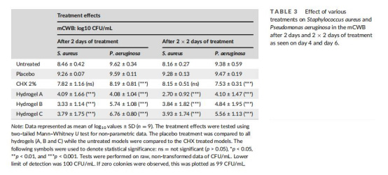 這篇論文開(kāi)發(fā)了一種改進(jìn)的體外慢性傷口生物膜模型(mCWB),旨在更真實(shí)地模擬人類(lèi)慢性傷口的微環(huán)境。核心創(chuàng)新包括:用哺乳動(dòng)物膠原替代植物源瓊脂作為基質(zhì);通過(guò)Transwell插入裝置實(shí)現(xiàn)傷口模擬培養(yǎng)基的動(dòng)態(tài)營(yíng)養(yǎng)交換;接種金黃色葡萄球菌(Staphylococcus aureus)和銅綠假單胞菌(Pseudomonas aeruginosa)形成雙菌種生物膜。模型在33°C下培養(yǎng),模擬傷口溫度。測(cè)試了三種含活性有機(jī)酸的可降解淀粉水凝膠(Hydrogel A/B/C)及2%洗必泰(CHX)對(duì)照。結(jié)果顯示,水凝膠顯著降低菌落數(shù)(CFU),逆轉(zhuǎn)堿性pH至酸性環(huán)境,并緩解氧氣消耗,效果優(yōu)于洗必泰。模型成功模擬了慢性傷口的缺氧、高pH和多菌種共存特征。